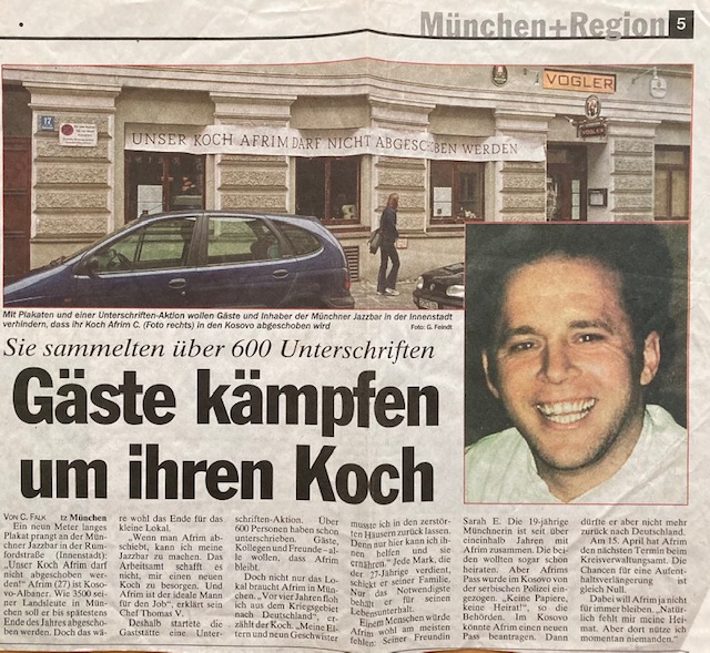 Weder eine Unterschriftenliste mit am Ende 2259 Unterschriften (damals hatte ich noch keinen Newsletter-Verteiler, es gab noch kein Facebook etc.), noch eine Petition im Landtag, noch eine CD, "Afrim & Die Voglers", noch das neun Meter lange Plakat über dem Lokal "Unser Koch Afrim darf nicht abgeschoben werden", noch das Bitten der Medien, noch diverse politische Bemühungen (über den damaligen Landtags-Präsidenten Johann Böhm, über Landtags- (und hierbei besonders der unermüdliche Einsatz vom Abgeordneten der Grünen, Dr. Martin Runge) und Stadtrats-Mitglieder (insbesondere Siegfried Benker) etc.), die Zusammenarbeit mit dem KVR, noch ... haben daran etwas ändern können.