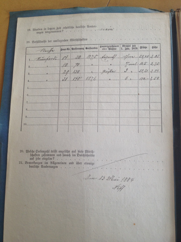 Aufschlussreich finde ich auch die Rückseite des Fragebogens. Dort wird unter Punkt "19" vermerkt, daß es in der Rumfordstrasse vier weitere "Wirthschaften" gab, alle zwischen 1875 und 1876 entstanden, von denen nur noch die Gaststätte in der Rumfordstrasse 14 existiert: