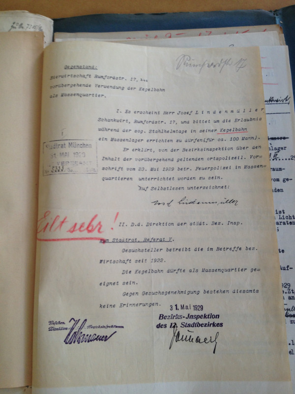 Am 31. Mai 1929 „erscheint Josef Lindenmüller, Schankwirt, Rumfordstrasse. 17 und bittet um die Erlaubnis, während der sog. Stahlhelmtage vom 31. Mai 1929 bis 3. Juni 1929 in seiner Kegelbahn ein Massenlager errichten zu dürfen (für ca. 100 Mann)“: