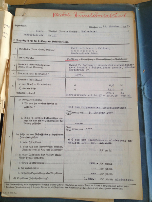 1947 vermerkt die Stadt München: „Die Betriebsräume wurden durch Luftangriffe sehr stark in Mitleidenschaft gezogen.“ Trotzdem möchte der Kellner Karl Albar das „Belvedere“ am 16.10.1947 übernehmen und erhält eine „vorläufige Betriebserlaubnis“. Im „Akt der Gewerbepolizei“ findet sich ein Bauplan vom 18.12.1947: Auch dort ist noch ein Schiesstand und eine Kegelbahn verzeichnet.